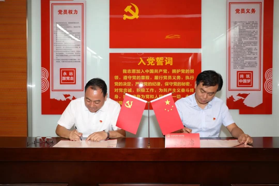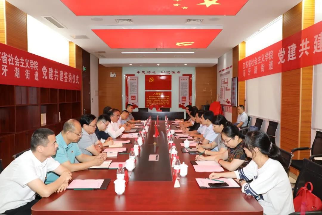 钱照亮和钱阳分别代表院机关党委和月牙湖街道工委签订党建共建协议。学院各党支部分别与月牙湖街道辖区有关单位及部分社区党支部负责人签订党建共建协议。