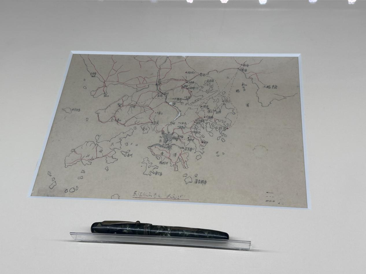 图为港九大队情报交通干事蔡仲敏使用过的钢笔及其绘制的港九简图。