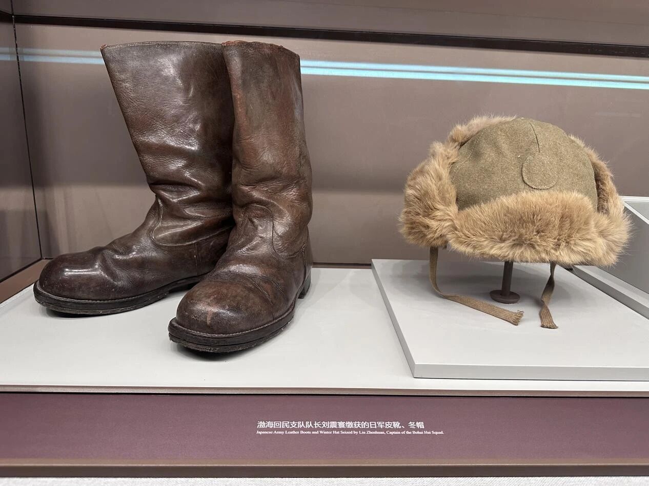 图为渤海回民支队队长刘震寰缴获的日军皮靴、冬帽。