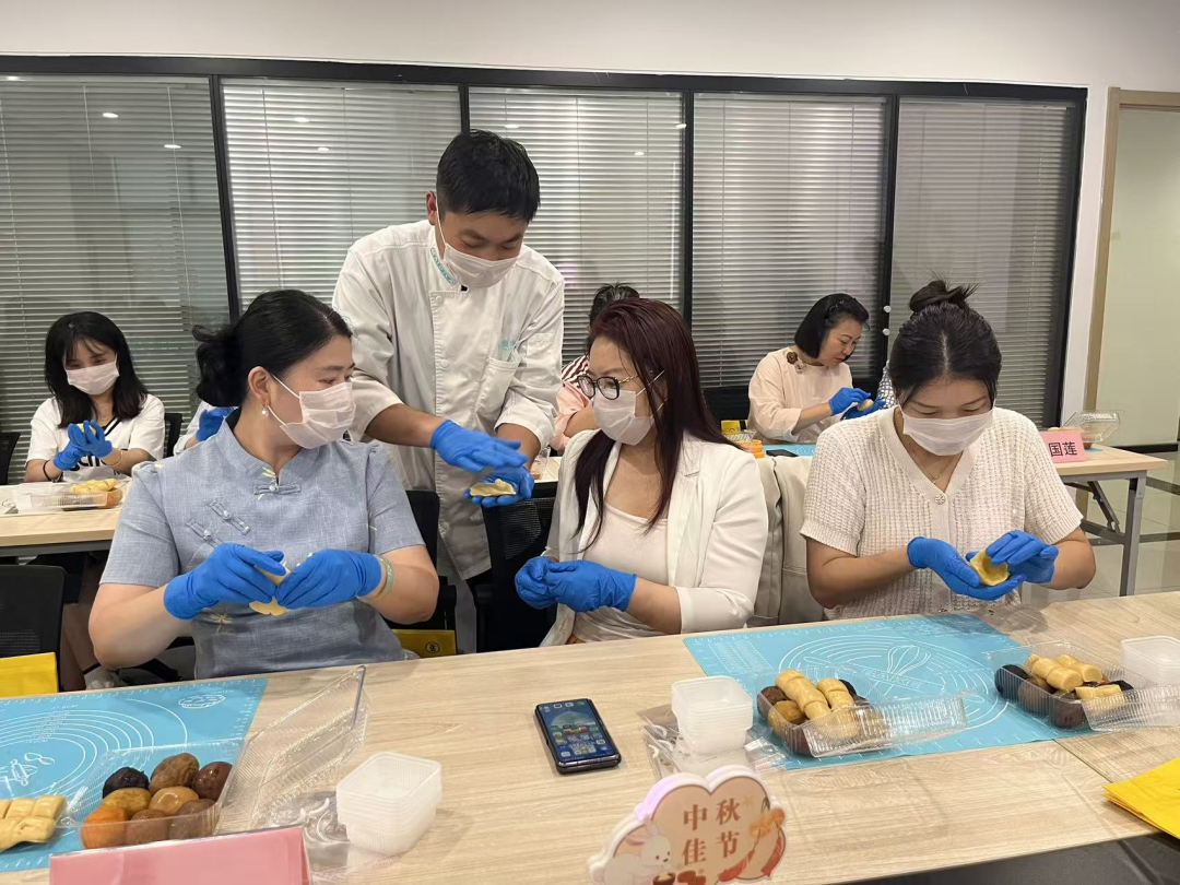 随后进行的“同心圆”月饼制作环节将现场气氛推至高潮。烘焙师现场展示广式月饼的制作流程。大家跟着揉面、包馅、压模、烘烤,不一会儿的功夫,一个个造型精致、香气扑鼻的广式月饼就制作完成了。大家互相交流技巧,活动现场笑声不断,香气四溢,充满了温馨和谐的节日气氛。