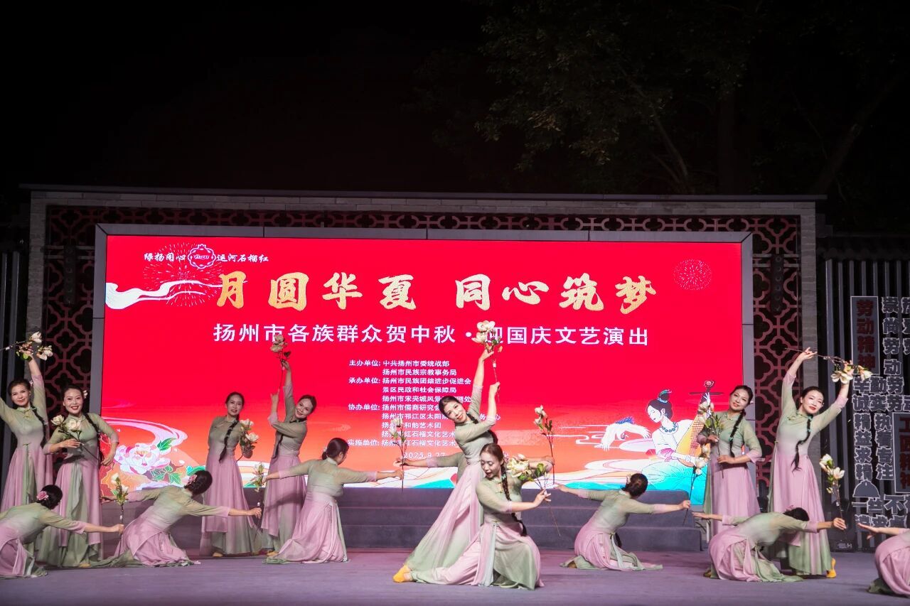 为传承中华优秀传统文化,弘扬爱国主义精神,进一步凝聚扬州各族群众情感,生动展现扬州“中华民族一家亲,同心共筑中国梦”的美好图景,9月27日晚,扬州市宋夹城红石榴公园内灯火璀璨、歌舞翩跹,扬州市委统战部、市民宗局联合举办“月圆华夏 同心筑梦——扬州市各族群众贺中秋·迎国庆文艺演出”。市委常委、统战部部长丁四海与近千名各族群众代表欢聚一堂,共赏明月、共话团圆,在传统文化浸润中深化民族团结情谊,奏响铸牢中华民族共同体意识的动人乐章。
