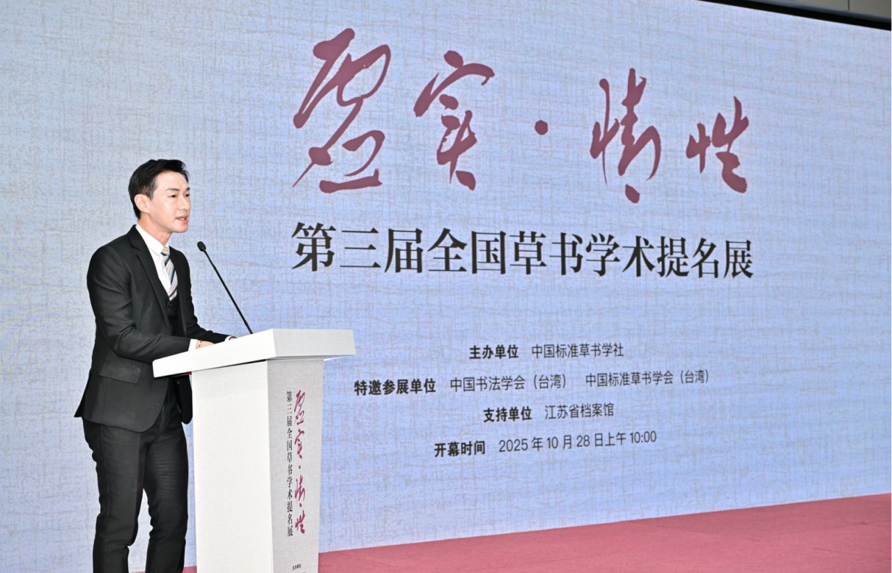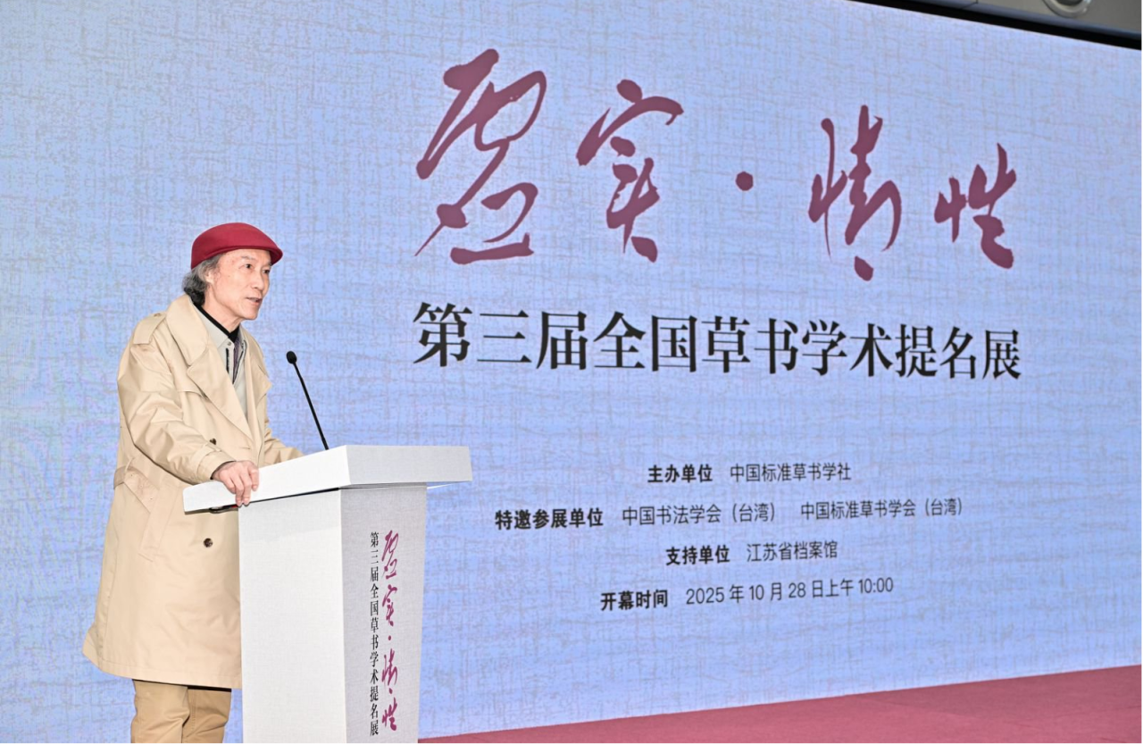 来自台湾的简名伟(南京云锦博物馆馆长)表示,书法艺术乃中华民族之瑰宝,此次全国草书学术提名展的举办,为两岸书法家搭建了珍贵的交流平台,让大家能在笔墨的流转间感受中华文化的博大精深,增进感情。未来期待与中国标准草书学社及两岸各界加强合作,共同推动书法艺术的传承与创新,让标准草书作为独特的文化载体,为增进两岸同胞的文化认同和情感联结注入更多正能量。