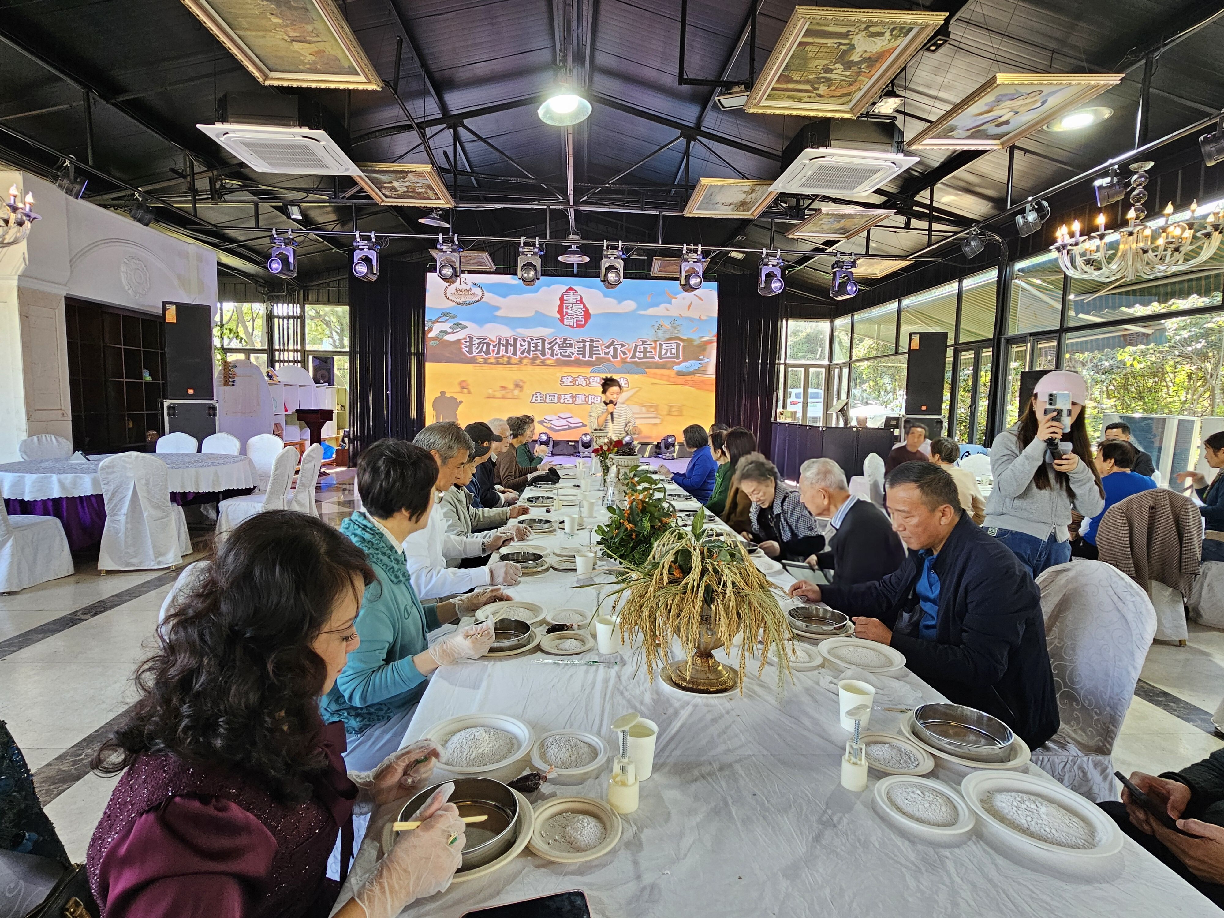 随后侨胞侨眷们来到润德菲尔庄园,投身于自然的怀抱。在指定的采摘区,大家兴致勃勃地体验了田园采摘的乐趣,亲手收获秋日的果实,感受现代农业与乡村旅游的丰硕成果。紧接着,“制作重阳糕”环节将活动推向又一个高潮。在工作人员的指导下,侨胞们亲手揉粉、包馅、塑形,制作寓意健康长寿的重阳糕,在欢声笑语中重温传统民俗,传递美好祝福。大家围坐一堂,畅叙桑梓情深。
