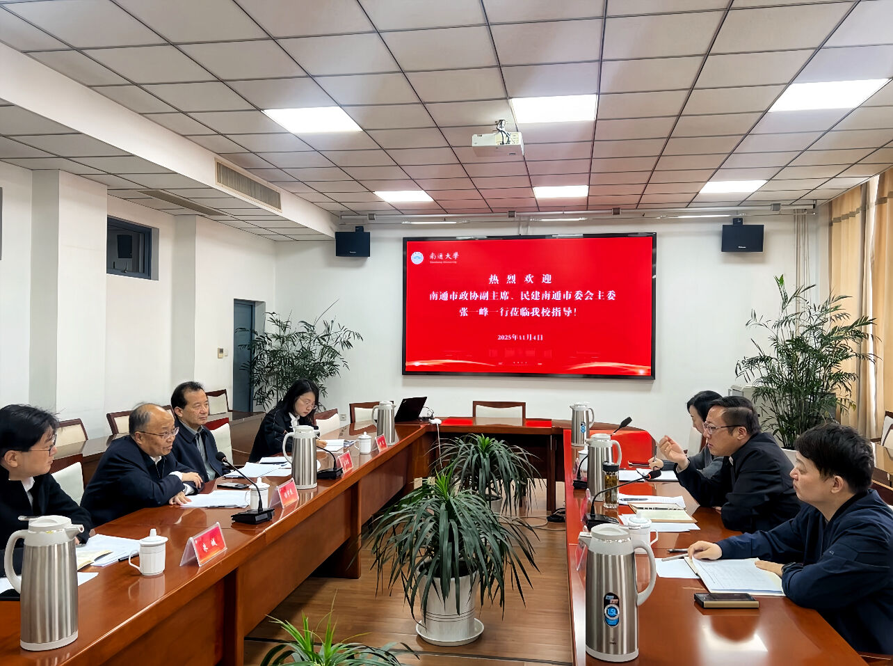 11月4日,南通市政协副主席、民建南通市委会主委张一峰一行赴南通大学交流。学校党委书记杨宇民,校党委副书记王卫东,校党委常委、统战部部长朱城出席座谈会。