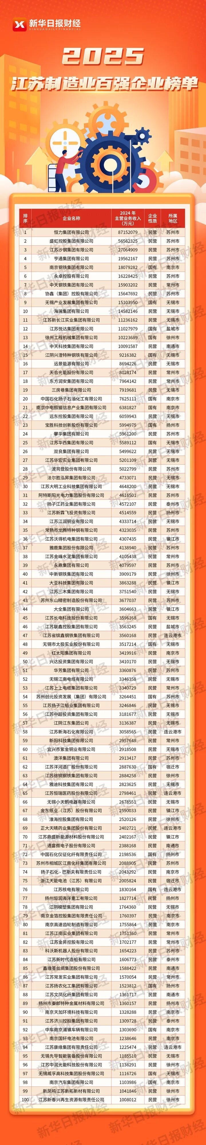 日前,江苏省企业联合会发布“2025江苏百强企业”(以下简称“百强”)、“2025江苏制造业百强企业”(以下简称“制造业百强”)和“2025江苏服务业百强企业”(以下简称“服务业百强”)三项榜单。数据显示,2024年江苏百强企业共计实现营业收入75515.80亿元,比上年增长2.03%,企业平均营收规模比上年增加26.55亿元,展现出强大的发展韧性和增长潜力。