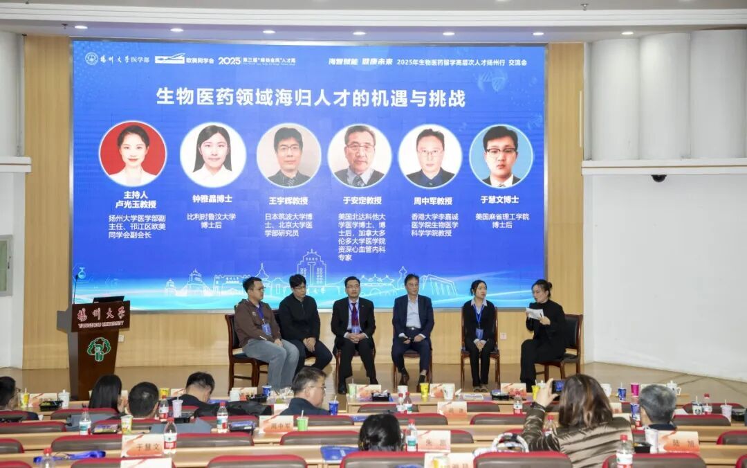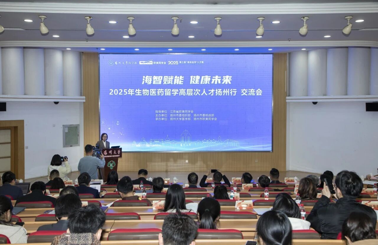11月17日,“海智赋能 健康未来”2025年生物医药留学高层次人才扬州行活动举行。扬州市委常委、统战部部长丁四海,扬州大学副校长、医学部主任龚卫娟出席活动并分别致辞。江苏省欧美同学会秘书长朱军,扬州市卫健委主任、市中医药管理局局长、市欧美同学会副会长王劲松,扬州大学医学部党委书记吕红梅,扬州市委统战部副部长吴立祥,宝应县委常委、统战部部长邹恺出席活动。生物医药领域海归人才、香港海学联会员代表、扬州大学医学部师生代表、市欧美同学会会员代表80余人参加活动。活动由扬州大学医学部常务副主任、市欧美同学会会长梁景岩主持。