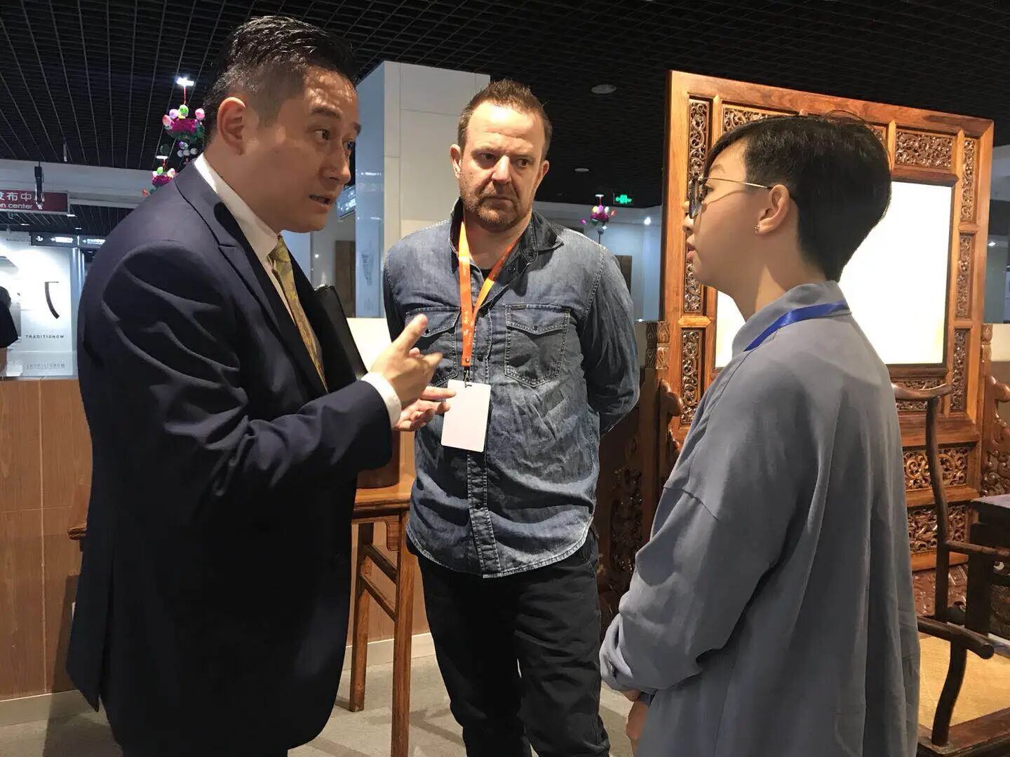 江楠在第八届南京历史文化名城博览会现场和设计师交流