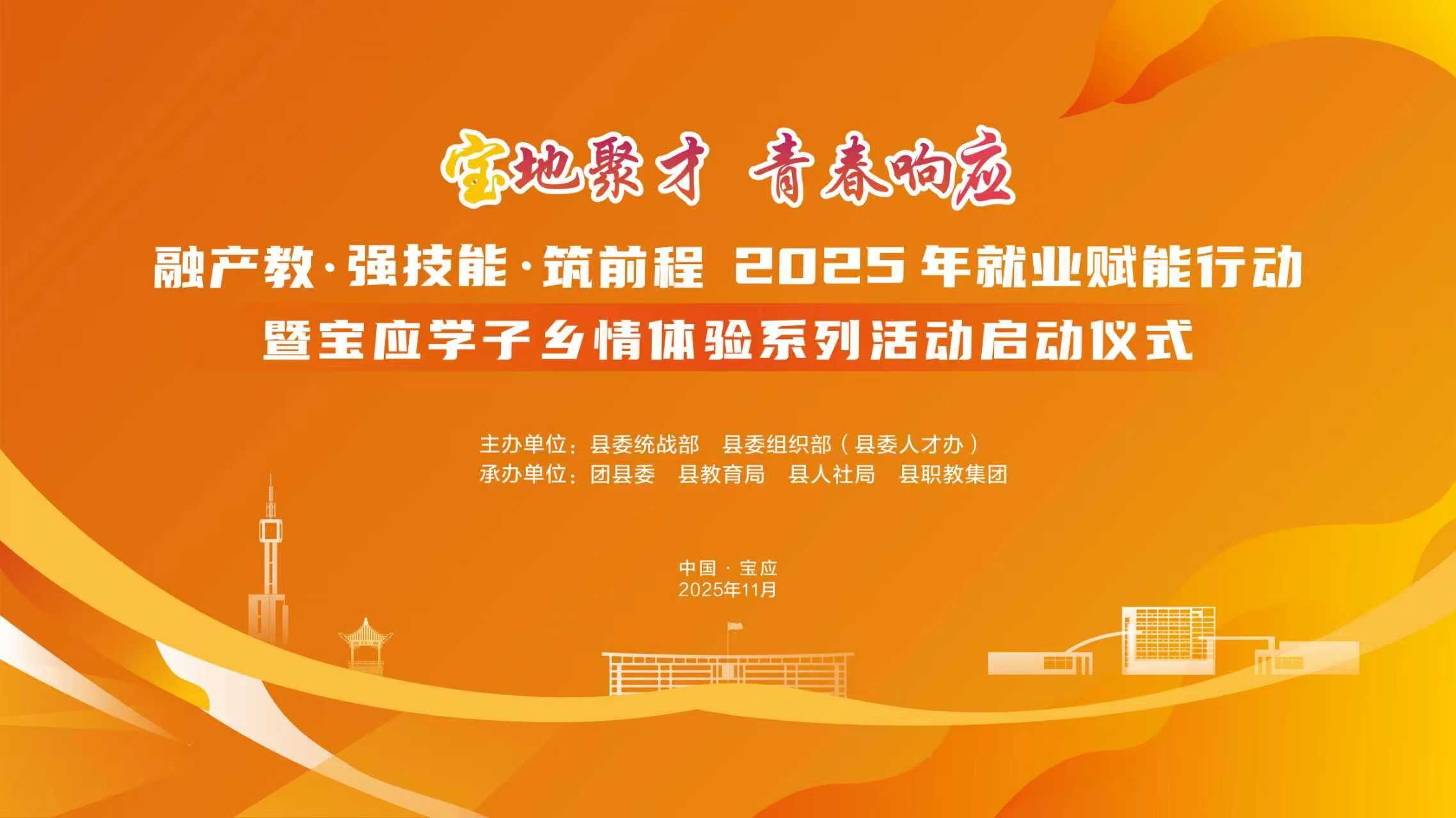 为深入贯彻落实扬州市委统战部“绿扬同心·匠星筑梦”行动方案,促进宝应统一战线服务职业教育高质量发展,11月17日下午,宝应县委统战部联合县委组织部(县委人才办)、团县委、县教育局、县人社局、县职教集团等部门单位举办“融产教·强技能·筑前程”2025年就业赋能行动暨宝应学子乡情体验系列活动启动仪式。