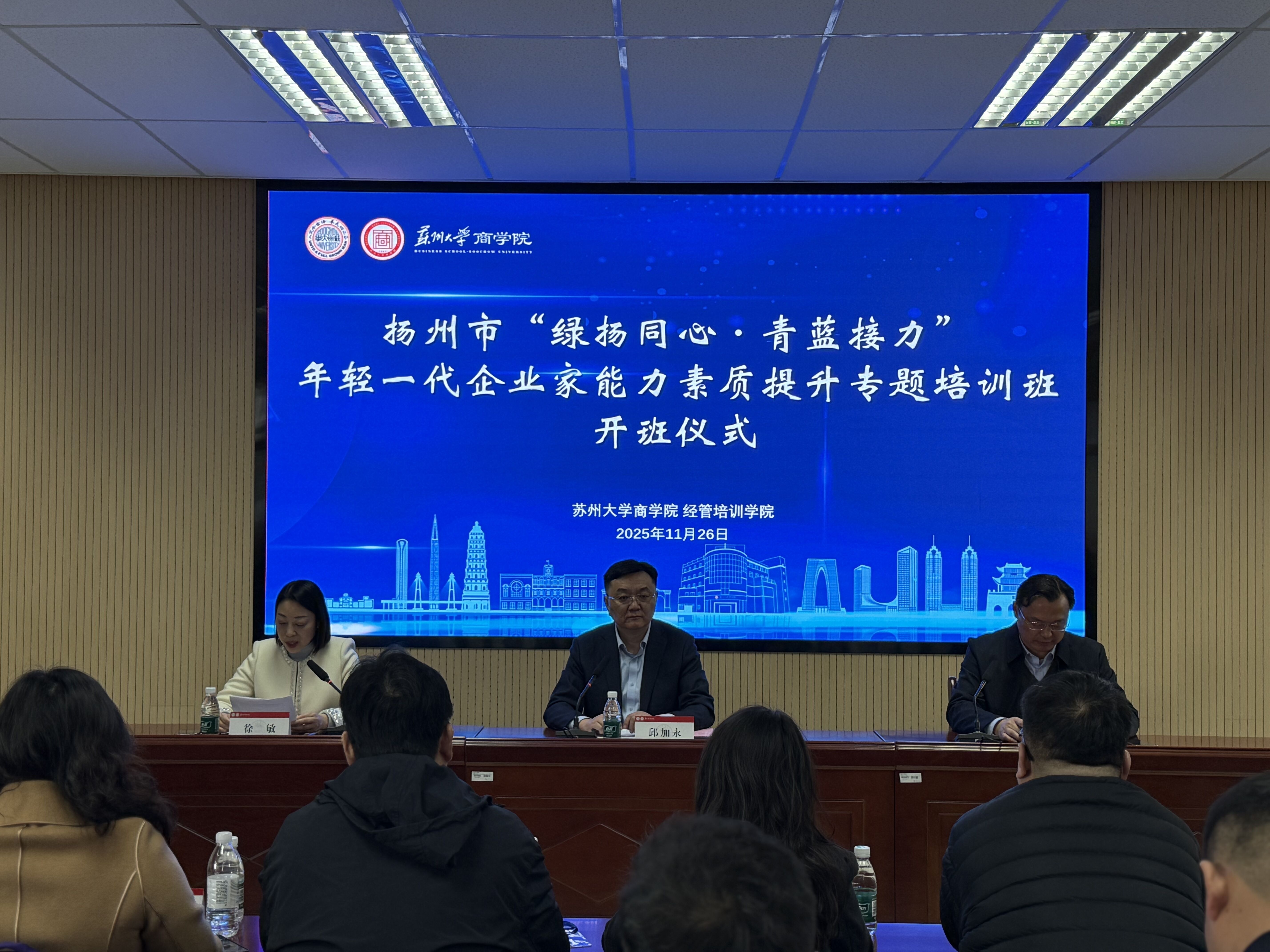 11月26日下午,扬州市委统战部、市工商联共同举办的“绿扬同心 青蓝接力”年轻一代民营企业家能力素质提升专题培训班在苏州大学开班。扬州市委统战部副部长、市工商联党组书记邱加永出席开班式并讲话,全市年轻一代企业家代表40多人参训。