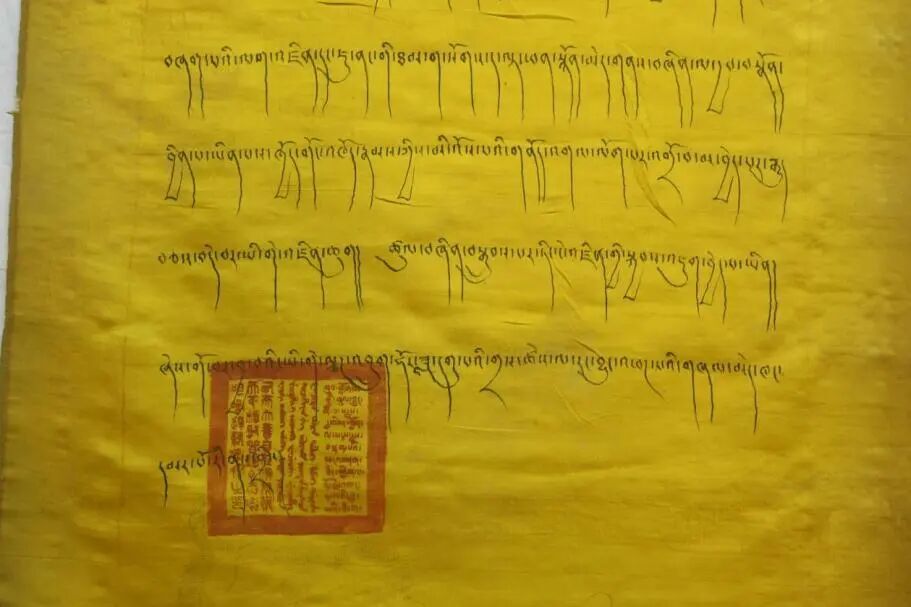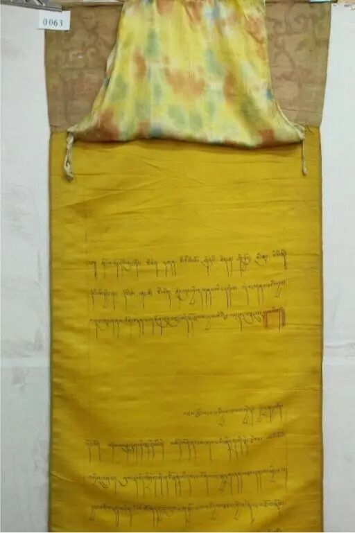 西藏博物馆收藏着一份六世达赖喇嘛发布的文告(图一)。这份发布于1700年(藏历铁龙年)的文件,书写于黄色丝绸上,装裱华丽如唐卡。