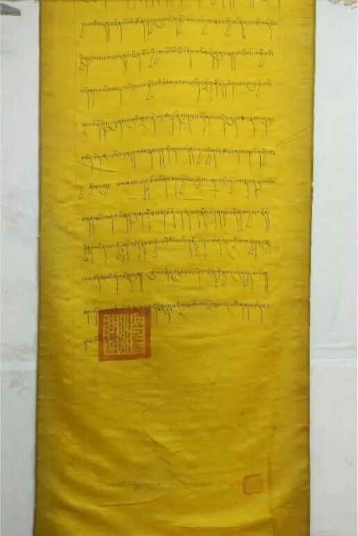 第四件文告发布于1698年(藏历土虎年)(图四),该文告是一件长达137厘米的黄色丝绸长卷,其起首格式同样具有重大政治意涵:“奉皇帝圣旨,在霍尔领土之上第六世达赖喇嘛金刚持颁布的法旨”。这句话言简意赅,却构成了一个完整的权力叙事闭环:皇帝的旨意是最高权威来源,达赖喇嘛的教令是在当时清朝管辖下的和硕特蒙古势力范围(霍尔领土)内行使。