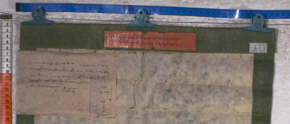 1703年文告中提到“先前有加盖第司·桑杰嘉措印章之五世达赖文告”,末尾落款“水羊年写于布达拉宫大殿”。文告正上方贴有红色纸签,藏文粗体书写“尊者第六辈仁波切洛桑仁钦仓央嘉措之文告”;左上方附有的白色纸片亦明确写有“尊者仓央嘉措晓谕汪丹贝娃瓦所拥有的土地、田产和房产及多热中应收取的差税如畜力和实物差税”等内容。