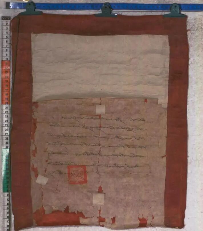 这类附着于文告的标识,与其正文共同构成了完整的档案实体,清晰地将文书权威与“第六辈达赖喇嘛仓央嘉措”这一身份紧密关联,为仓央嘉措的政教身份与职权行使,提供了不可多得的原始实物证据。