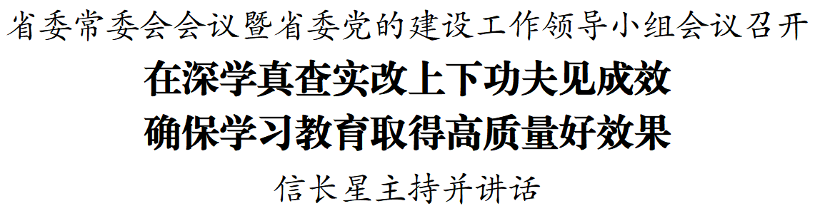 2月28日,省委常委会会议暨省委党的建设工作领导小组会议召开,深入学习贯彻习近平总书记关于树立和践行正确政绩观学习教育的重要讲话和重要指示精神,全面落实中央党的建设工作领导小组会议和有关通知要求,审议我省学习教育《实施方案》,部署启动我省树立和践行正确政绩观学习教育工作。省委书记、省委党的建设工作领导小组组长信长星主持会议并讲话。