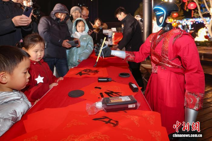 文能手写春联,武能跳舞后空翻,机器人成了老人孩子都喜欢的金牌“演员”。泱波 摄
