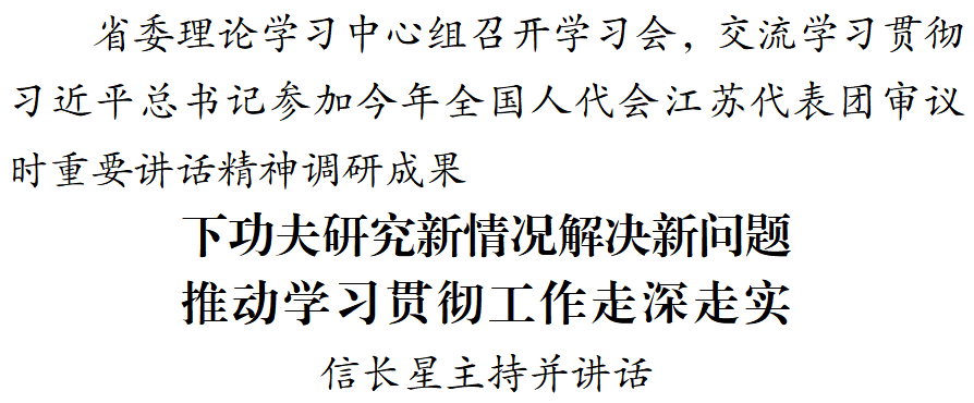 4月21日,省委理论学习中心组召开学习会,交流学习贯彻习近平总书记参加今年全国人代会江苏代表团审议时重要讲话精神调研成果。省委书记信长星主持会议并讲话。
