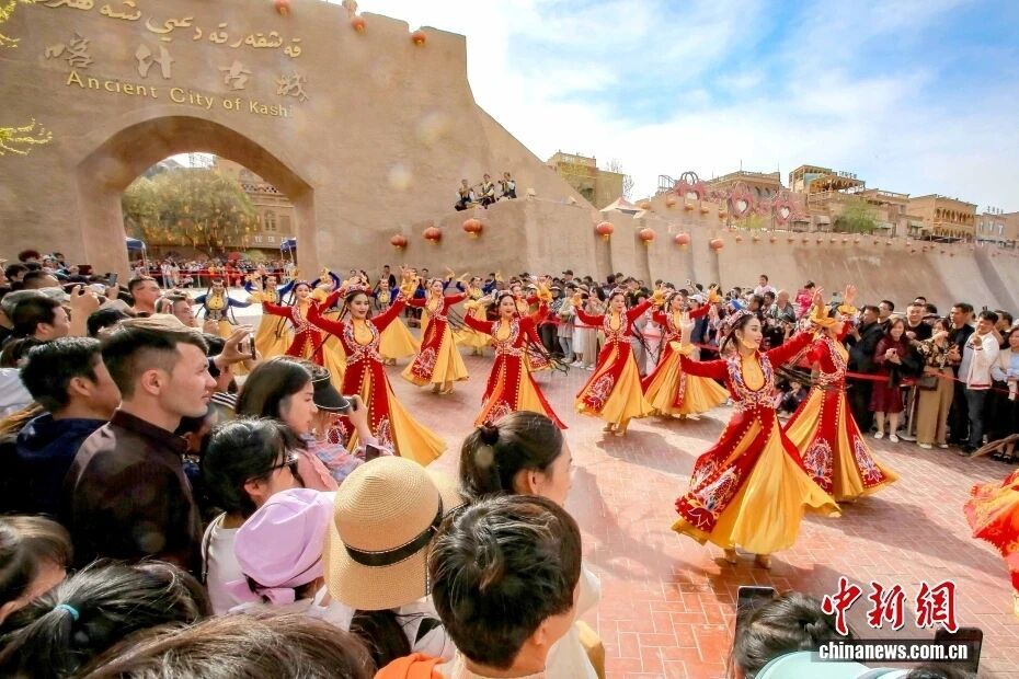 图为游客在新疆喀什古城景区观看歌舞表演。